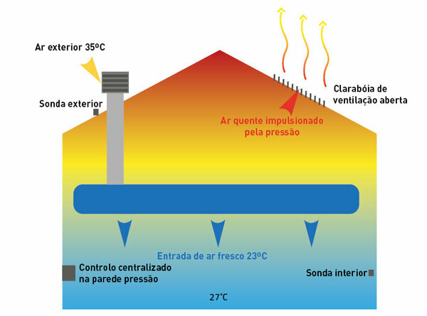 É de notar que esta solução deve estar associada a aberturas na cobertura, que também podem ser controladas, e que permitirão retirar a pressão do edifício e evacuar o ar quente.